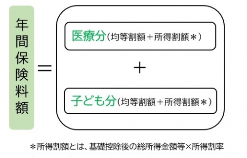 保険料は「医療分」と「子ども分」の合計額で、被保険者が等しく負担する『均等割額』と、被保険者の所得に応じて負担する『所得割額』をそれぞれ算定して決定します。保険料率は医療費分は2年ごとに、子ども分は1年ごとに見直されます。